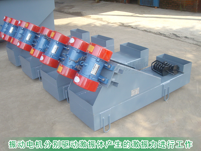本設備由兩臺振動電機分別驅動激振體產生的激振力進行工作的,這兩臺振動電機和一對可變力輪組成第二質體,通過支撐彈簧和基座相連,不隨著共振體的振動而振動。