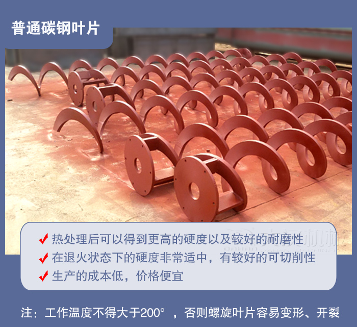 螺旋輸送機應(yīng)用廣泛,常用于物料的輸送,塊狀、顆粒狀、粉狀等物料,或者一些高溫、腐蝕物料,代替了人工的搬運,效率更高。常見的螺旋葉片有普通碳鋼葉片,高錳鋼葉片以及不銹鋼葉片。