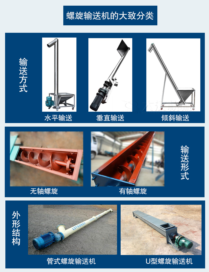 螺旋輸送機(jī)從輸送方式上可以分為:水平輸送,垂直輸送,以及傾斜輸送三種。