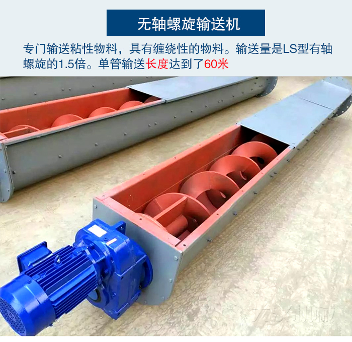 無軸螺旋輸送機(jī)又是,在LS型螺旋輸送機(jī)的基礎(chǔ)上進(jìn)行改進(jìn)的。由于LS型螺旋輸送機(jī)結(jié)構(gòu)所以無法輸送一些,有粘性和纏繞性的物料。所以就出現(xiàn)了無軸螺旋輸送機(jī)。因此無軸螺旋輸送機(jī)就成為了專門輸送一些,粘性物料,具有纏繞性的物料。無軸螺旋輸送機(jī)不僅在物料上有所突破,在輸送量上也超過了LS型有軸螺旋的1.5倍。并且單管輸送長度達(dá)到了60米的輸送距離。