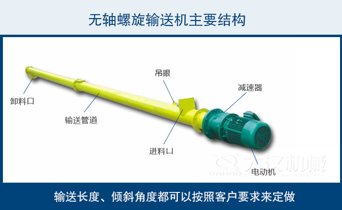 驅(qū)動、殼體、襯板、葉片、 支架、蓋板、進料口、出料口,輸送長度、傾斜角度都可以按照客戶要求來定做,不同物料不同輸送角度我們?yōu)槟侠磉x型!