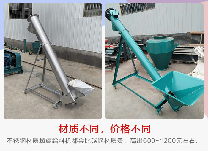 螺旋給料機(jī)可以分為碳鋼和不銹鋼材質(zhì)兩種,由于這兩者材質(zhì)成本有差異,碳鋼螺旋給料機(jī)適合普通物料輸送,不銹鋼螺旋給料機(jī)主要用于輸送機(jī)一些腐蝕性、高溫物料,也用于食品、醫(yī)藥等對輸送環(huán)境有衛(wèi)生標(biāo)準(zhǔn)的行業(yè),所以不銹鋼材質(zhì)螺旋給料機(jī)都會(huì)比碳鋼材質(zhì)貴,一般會(huì)高出600~1200元左右。