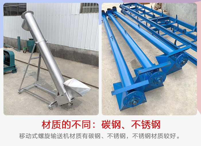 移動式螺旋輸送機材質(zhì)有碳鋼、不銹鋼,不銹鋼材質(zhì)的價格要貴1倍左右,不銹鋼的主要用于對輸送環(huán)境要求高的行業(yè),清潔度高,不會污染物料,使用時間長,造價也相對高。碳鋼材質(zhì)可以主要應(yīng)用在一些對物料要求不是很嚴(yán)格或?qū)?,螺旋輸送機的衛(wèi)生沒什么特別要求的地方,例如:一些煤炭,石灰,石子等一些顆粒狀的行業(yè)。