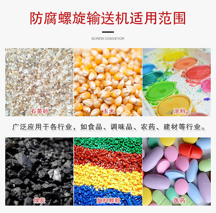 防腐螺旋輸送機(jī)廣泛應(yīng)用于各行業(yè),如食品、調(diào)味品、農(nóng)藥、獸藥、建材、化工、電力、冶金、煤礦炭、糧食等行業(yè),適用于水平或傾斜輸送粉狀、粒狀和小塊狀物料,尤其適合食品、醫(yī)藥行業(yè),滿足行業(yè)衛(wèi)生標(biāo)準(zhǔn),可輸送諸如面粉、飼料、花椒粉、藥粉等物料。