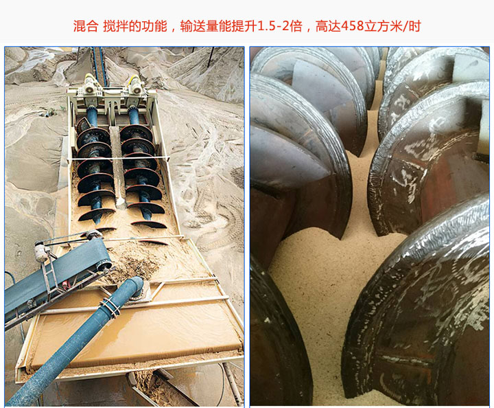 雙軸螺旋輸送機(jī)是兩片螺旋葉片組合而成,兩根螺旋軸相反方向旋轉(zhuǎn),具備混合、攪拌的功能,輸送量能提升1.5-2倍,高達(dá)458立方米/時(shí)。