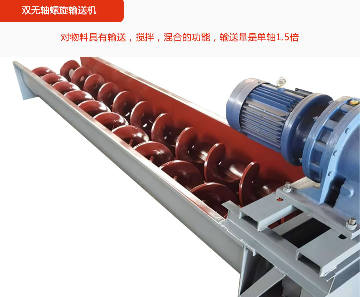 雙無軸螺旋輸送機(jī):采用兩根螺旋軸組成,且軸旋轉(zhuǎn)方向相反,輸送物料同時還可對物料攪拌,混合,其輸送量是單軸1.5倍