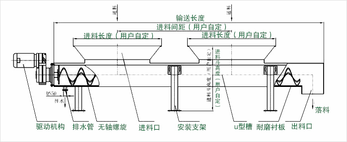 水平主要由驅(qū)動(dòng)裝置、中間軸承、螺旋軸、螺旋體、螺旋葉片、頭部、中部、尾部、進(jìn)出料裝置等部件組成。