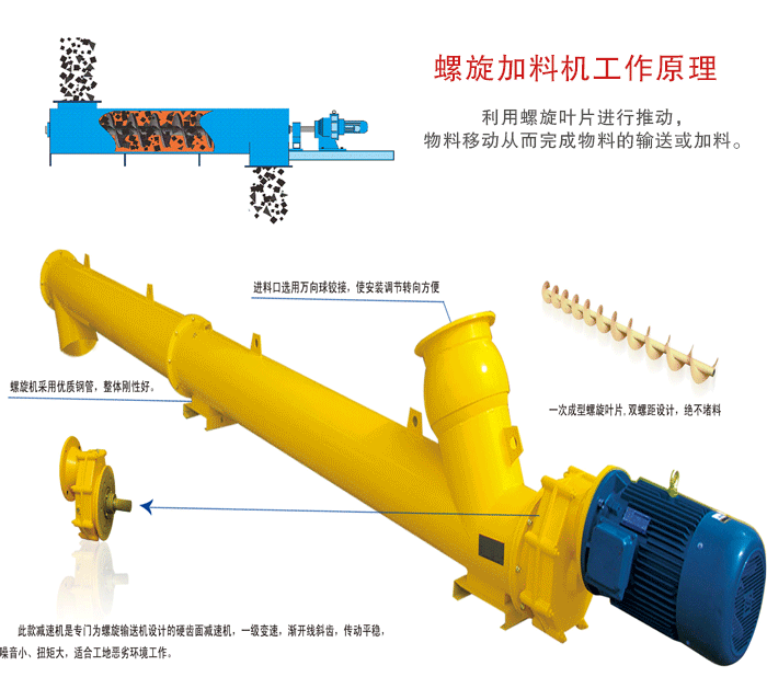 螺旋加料機主要的輸送角度為傾斜0°到45°之間大于45°就不能完成自由調(diào)整角度的功能,主要的輸送原理是利用螺旋葉片進行推動,物料移動從而完成物料的輸送或加料。