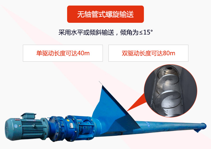 無軸?管式螺旋輸送機(jī)也叫管式無軸螺旋輸送機(jī),其外形為圓管式,可水平或傾斜輸送,其傾角為≤15°,有雙驅(qū)動和單驅(qū)動之分,單驅(qū)動螺旋機(jī)長度可達(dá)40m,雙驅(qū)動螺旋機(jī)采用中間斷開軸結(jié)構(gòu),長度可達(dá)80m。由于采用了無軸設(shè)計,可輸送粘性強(qiáng)、易纏繞的物料,物料不易堵塞,排料口不堵塞。