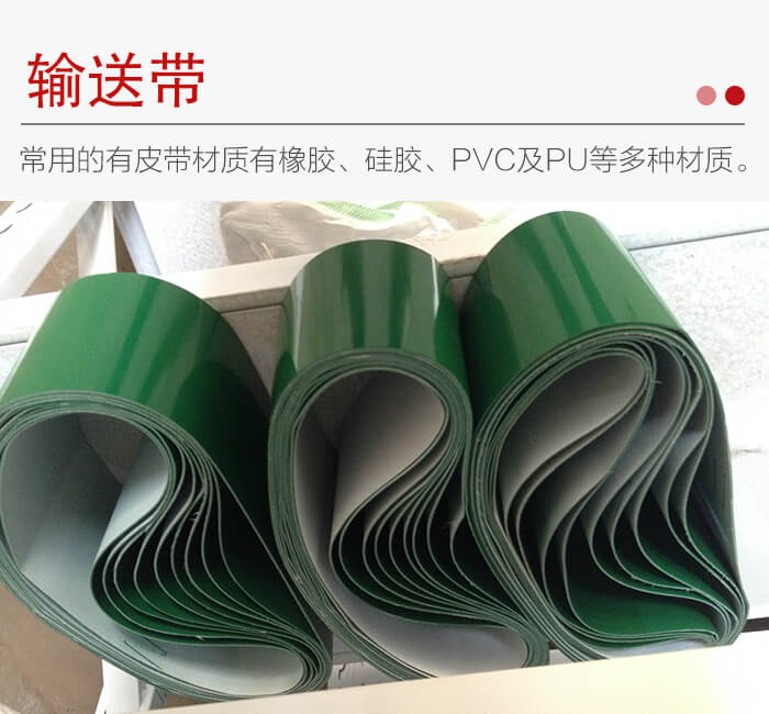 在皮帶輸送機(jī)上常用的有皮帶材質(zhì)有橡膠、硅膠、PVC及PU等多種材質(zhì)。橡膠帶適用于工作環(huán)境溫度-15至40℃之間。物料溫度在50℃以下,50℃以上的要求在訂貨時需告知廠家,可以選用耐高溫輸送帶。向上輸送散粒料的傾角12°至24°。對于大傾角輸送可用裙邊帶。