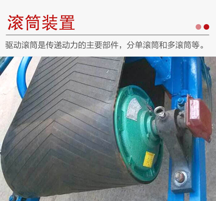 皮帶輸送機(jī)滾筒裝置分為驅(qū)動滾筒和改向滾筒。驅(qū)動滾筒是傳遞動力的主要部件,分單滾筒(膠帶對滾筒的包角為210°至230°)、雙滾筒(包角達(dá)350°)和多滾筒(用于大功率)等。