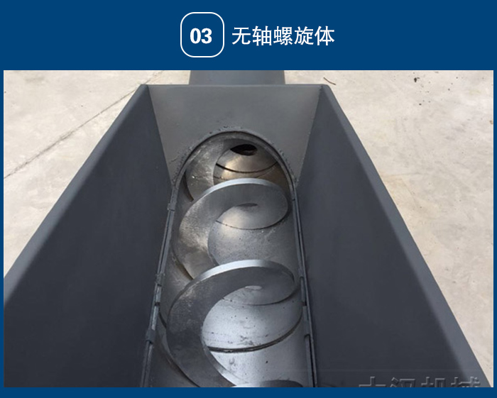 該設(shè)備采用無軸螺旋式,當(dāng)物料從輸送機的進料斗進入,依靠螺旋葉片的旋轉(zhuǎn)將物料推移滑行,沿U型輸送槽送至出料口,并與壓榨機或垃圾小車配套,將物料進行下一步處理。