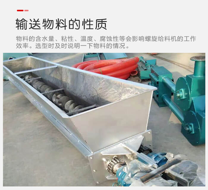 物料的含水量、粘性、溫度、腐蝕性等會(huì)影響螺旋給料機(jī)的工作效率,舉例來(lái)說(shuō),如含水量大,粘性強(qiáng)的物料在輸送過(guò)程中比較容易粘連在螺旋葉片上,會(huì)出現(xiàn)結(jié)塊現(xiàn)象,這樣會(huì)大大削減螺旋給料機(jī)的輸送效率和使用壽命,在選型的時(shí)候,用戶需要事先向廠家說(shuō)明一下物料的情況,以便廠家為您推薦合適的型號(hào)。