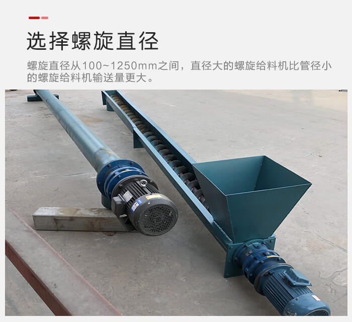 螺旋給料機(jī)螺旋直徑從100~1250mm之間,選擇不同的管徑對(duì)于單位時(shí)間輸送量是有直接的影響的,直徑大的螺旋給料機(jī)比管徑小的螺旋給料機(jī)輸送量更大。