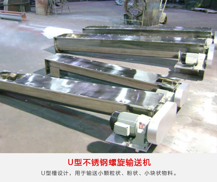 為U型槽設(shè)計,用于輸送小顆粒狀、粉狀、小塊狀物料。不適宜輸送易變質(zhì)、黏性較大易結(jié)塊以及含水量較大的物料,每小時輸送量在9-134噸之間,U型不銹鋼螺旋輸送機具有密封性好、承載轉(zhuǎn)距大、噪音低、不滲油等顯著特點。