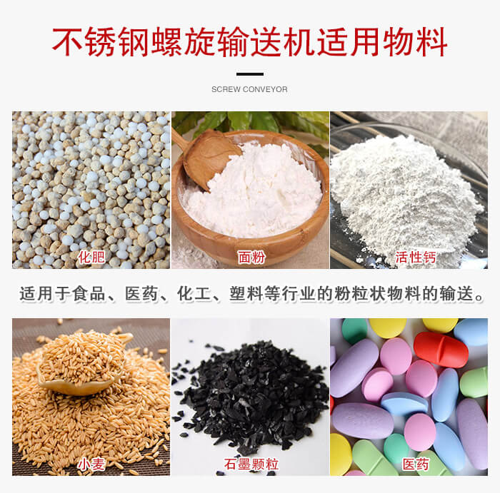注:垂直式不銹鋼螺旋輸送機適宜垂直或大傾角輸送粉狀、粒狀、非黏性的物料,如:糧食、飼料、化工原料、水泥等,不適宜輸送輸送塊狀、粘性及流動性強的物料,如:粉煤灰。