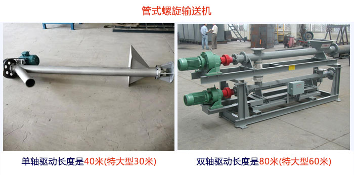 管式螺旋輸送機(jī)單軸驅(qū)動(dòng)長度是40m(特大型30m),雙軸驅(qū)動(dòng)長度是80m(特大型60m),長度劃分是每一檔0.5m,可根據(jù)自身需求選擇。