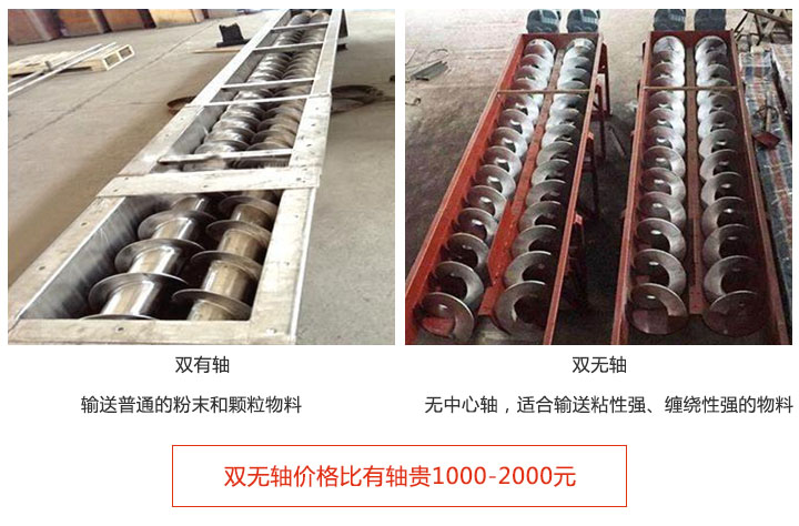 注:雙無軸螺旋輸送機價格比有軸貴1000-2000元,因為采用無軸設(shè)計,可解決易纏繞物料的輸送,且設(shè)計難度比有軸大。