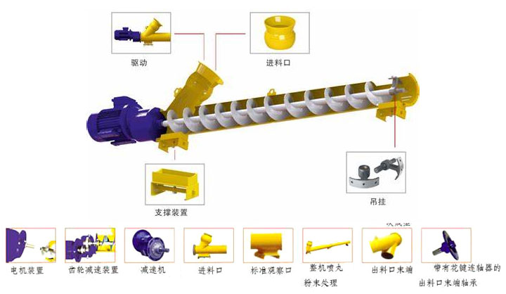水泥螺旋輸送機(jī)由進(jìn)料口,出料口,電機(jī),減速機(jī),螺旋葉片,螺旋管體,等組成,附帶電纜線,連接帆布套,吊掛鋼絲繩等配件。