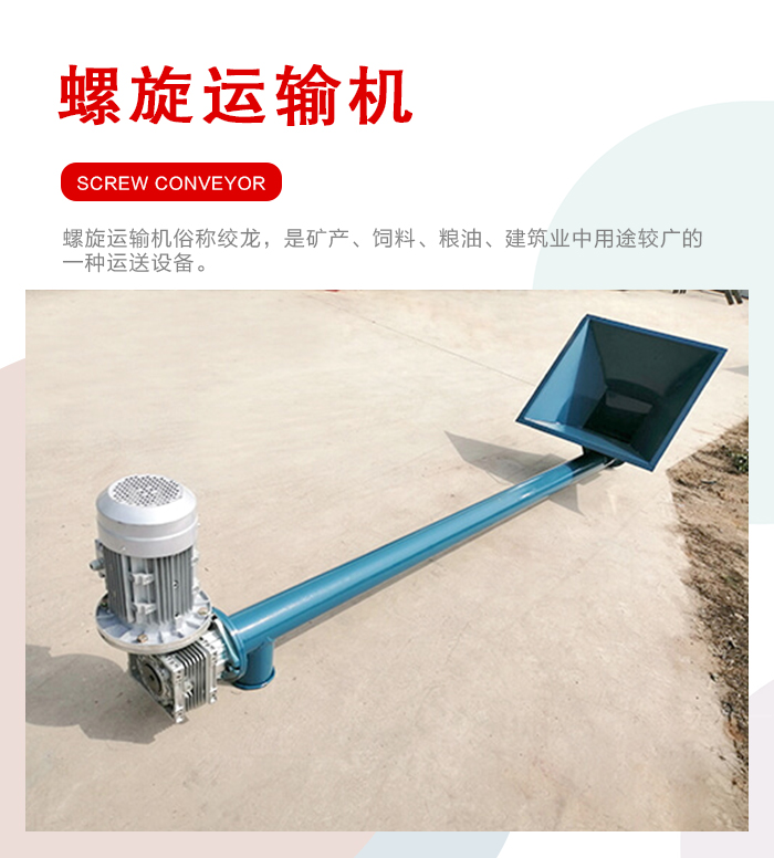 簡介:螺旋運(yùn)輸機(jī)分為水平式螺旋運(yùn)輸機(jī)和筆直式螺旋運(yùn)輸機(jī)兩大類型
