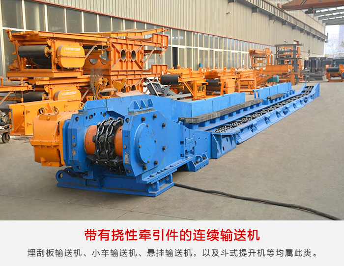 帶式輸送機(jī)、鏈板輸送機(jī)、刮板輸送機(jī)、埋刮板輸送機(jī)、小車輸送機(jī)、懸掛輸送機(jī),以及斗式提升機(jī)等均屬此類。其工作特點(diǎn)是把物品置于承載件上,由撓性牽引件搬運(yùn)承載件沿著固定的線路運(yùn)動,靠物品和承載件的摩擦力使物品與牽引件在工作區(qū)段上一起移動。