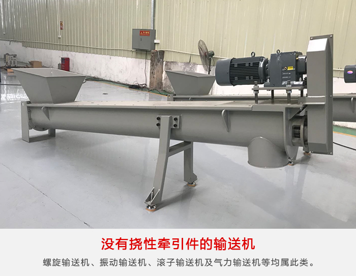 螺旋輸送機(jī)、振動輸送機(jī)、滾子輸送機(jī)及氣力輸送機(jī)等均屬此類。其工作特點(diǎn)是使物品與推動件分別運(yùn)動。推動件作旋轉(zhuǎn)運(yùn)作(滾子輸送機(jī))或往復(fù)運(yùn)動(振動輸送機(jī))時,依靠物品與承載件間的摩擦力或慣性力,使物品向前運(yùn)動,而推運(yùn)件自身仍保持或回復(fù)到原來位置。