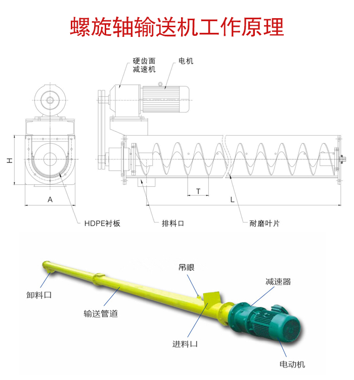 螺旋軸輸送機(jī)主要由驅(qū)動裝置,機(jī)殼、蓋板、螺旋軸、螺旋葉片、進(jìn)料口、出料口等部件組成。