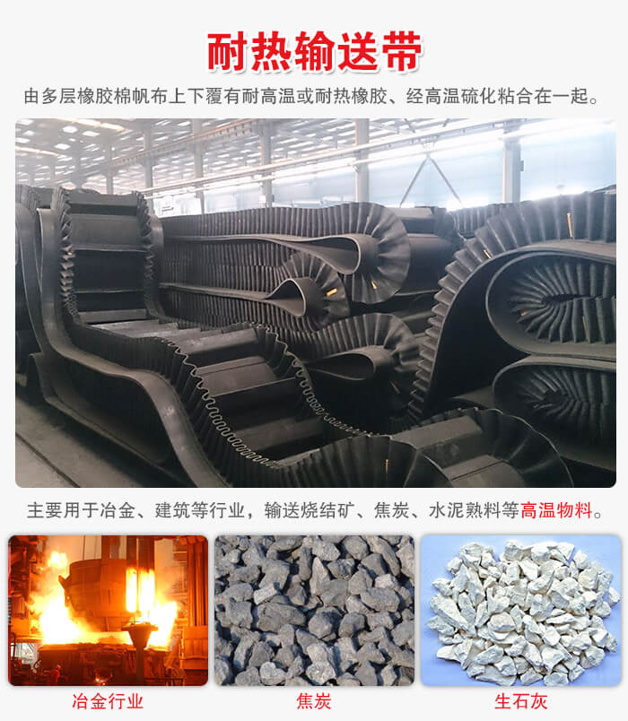 耐熱輸送帶是由多層橡膠棉帆布(滌棉布)或者聚酯帆布上下覆有耐高溫或耐熱橡膠、經(jīng)高溫硫化粘合在一起的,可以輸送175℃以下熱焦碳、水泥、熔渣等物料,主要用于冶金、建筑等行業(yè),輸送燒結(jié)礦、焦炭、水泥熟料等高溫物料。